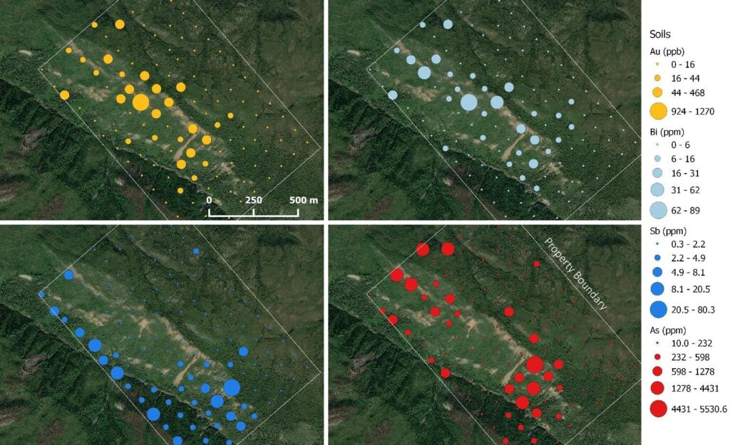 Figure 1: Intense, zoned, multi-element soil anomaly associated with eroded exposures of a hornfelsed zone around newly-discovered intrusive rocks at Rainbow. High spatial correlation between gold and bismuth, with anomalous antimony and arsenic peripheral to the gold zone is similar to zoning observed in known reduced intrusion related gold systems such as Kinross Gold?s Ft. Knox deposit in Alaska.