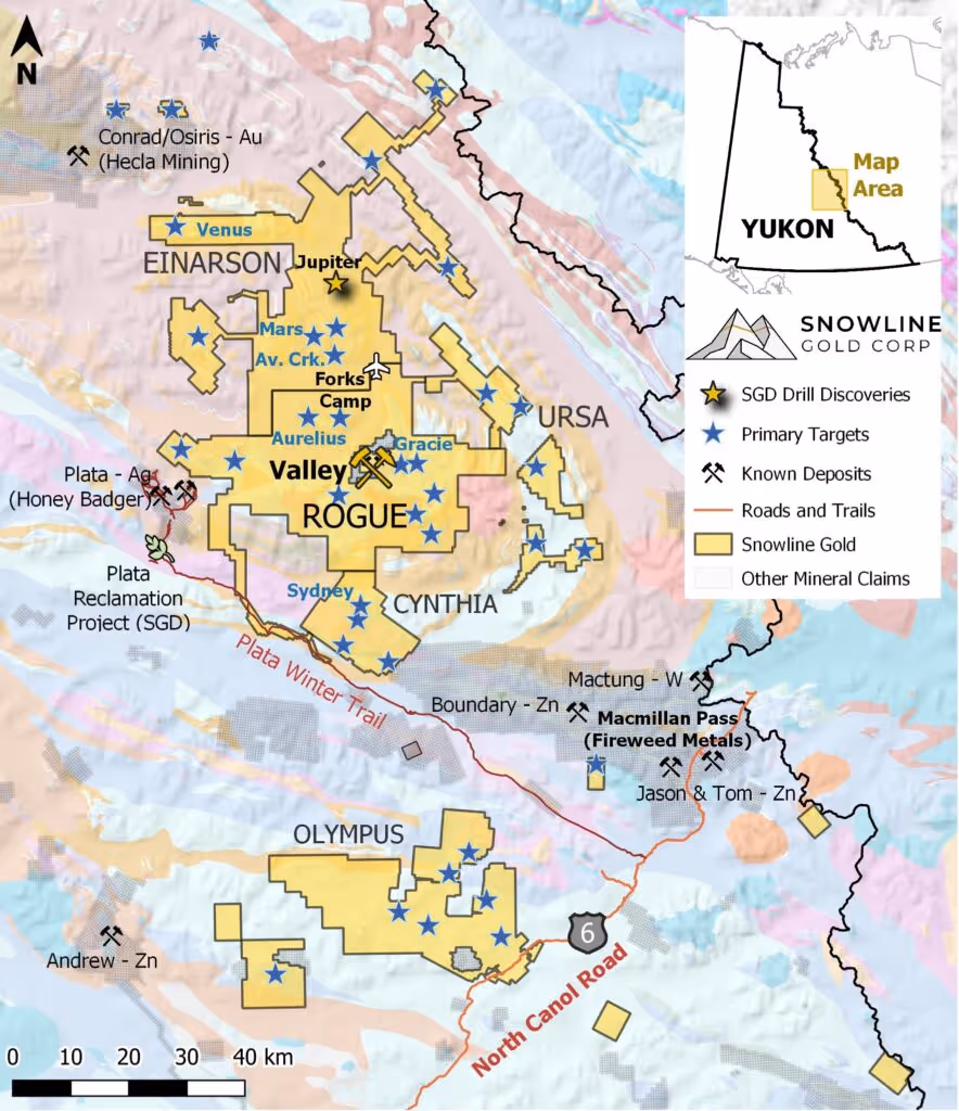 Figure 1 – Project location map for Snowline Gold’s eastern Selwyn Basin properties: Rogue, Einarson, Ursa, Cynthia and Olympus. The Valley deposit is one of a cluster of prospective reduced intrusion-related gold targets on the broader 30 x 60 km Rogue Project, within a broader emerging district almost entirely controlled by Snowline.
