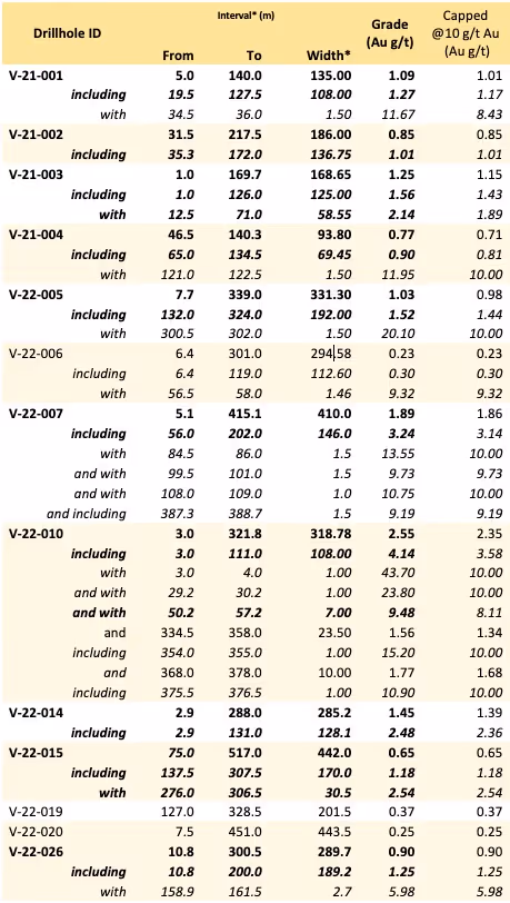 Unusually high gold grades for an RIRGS were intersected from surface, such as 2.55 g/t Au over 318.8 m including 4.14 g/t Au over 108 m in V-22-010 (see Snowline news release dated October 12, 2022). These intersections exhibit a high degree of gold grade continuity within and between holes.