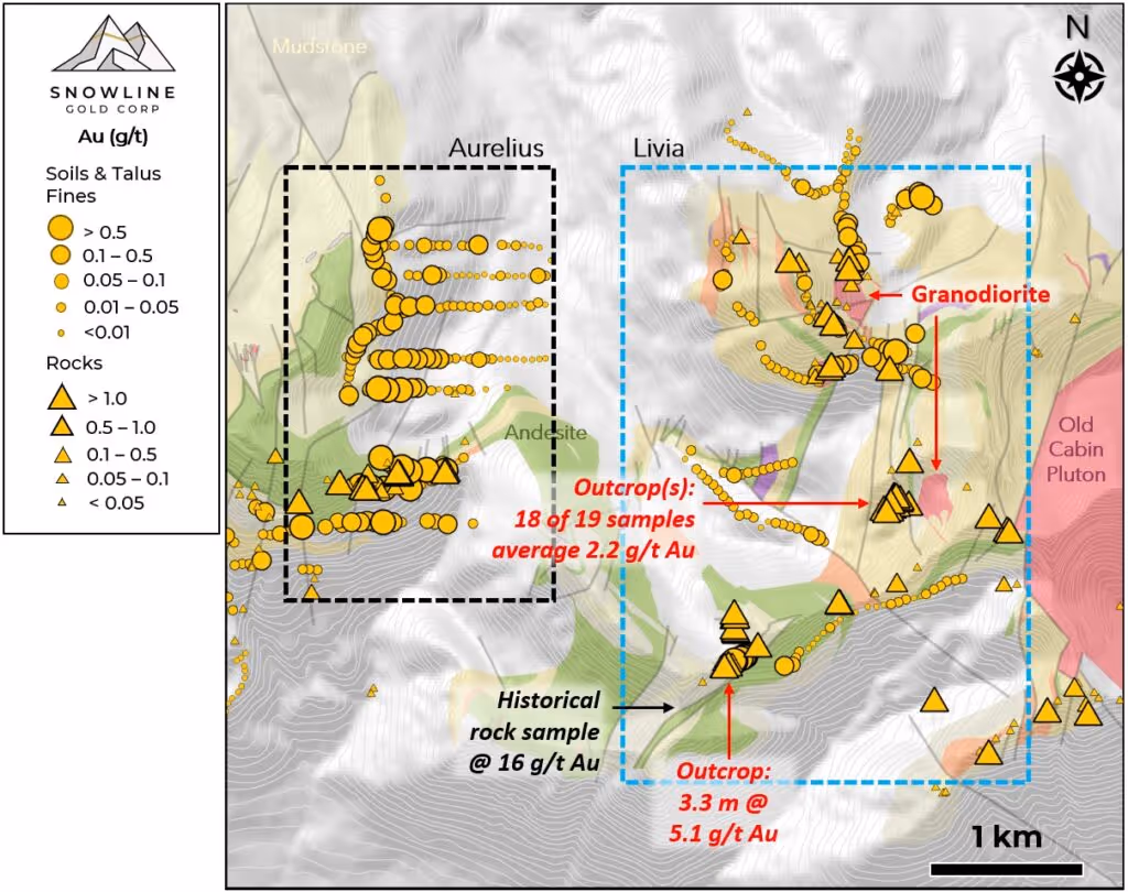 Figure 2 – Plan view of the Aurelius and Liva targets, showing the known extent of anomalous gold values in surface geochemistry and the location of various rock samples. Zones of elevated to anomalous gold mineralization are present across an open 4 x 2.5 km area, centered roughly 3 km east of Snowline’s Aurelius target.