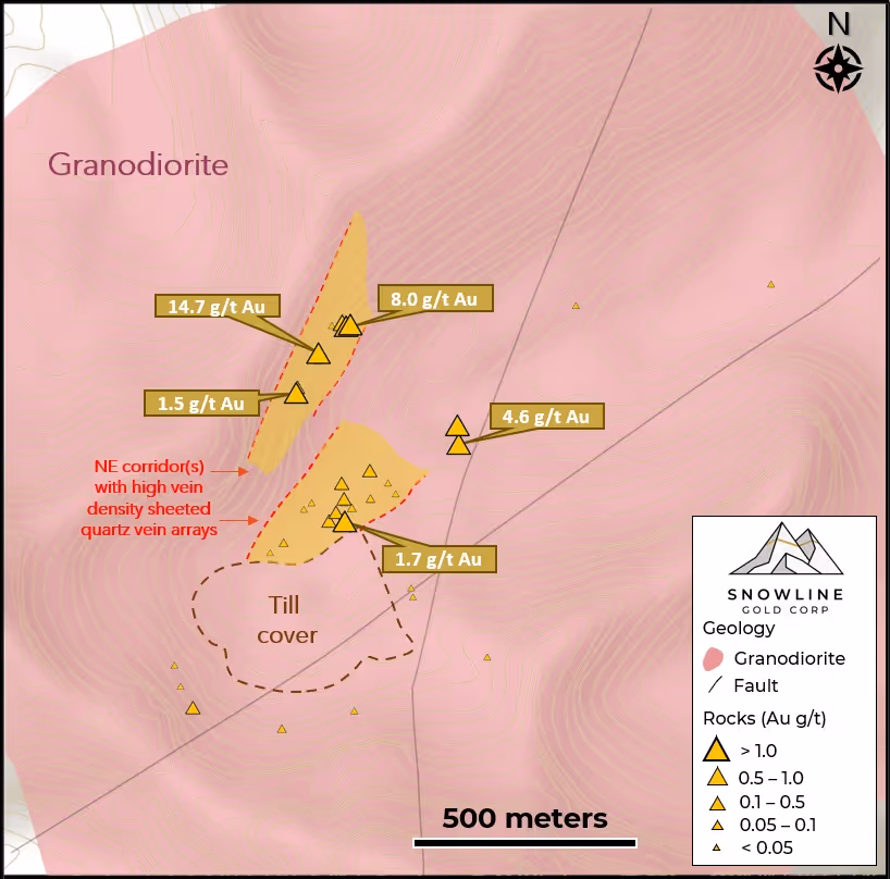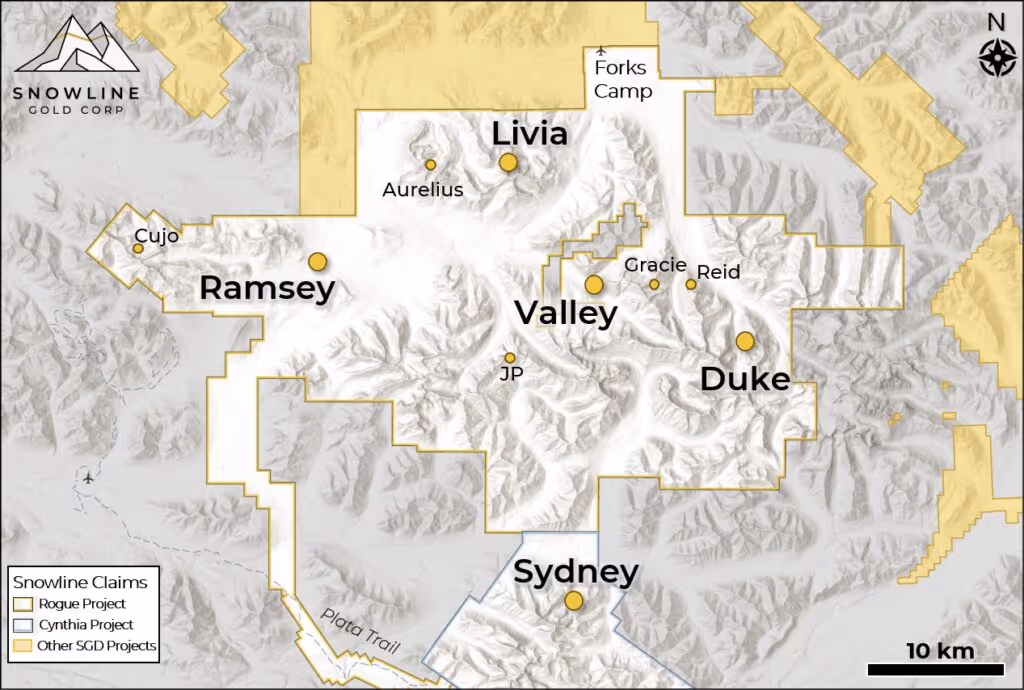 “While consistent drill results have dominated our headlines, Snowline’s regional surface exploration team has done exemplary work behind the scenes bolstering our exploration pipeline and demonstrating widespread gold fertility within the regional-scale Rogue Plutonic Complex,” said Scott Berdahl, CEO & Director of Snowline. “The presence of our Valley discovery shows that the geological ingredients needed to produce a uniquely robust form of RIRGS mineralization are present at Rogue. The results of our regional work suggest a strong potential for locating other such instances of gold endowment across much of the broader, >1,100 km2 project area. With essentially the entire Rogue Plutonic Complex under full ownership, we are thrilled to have the opportunity to systematically explore this nascent gold district, along with the resources and the team to make the most of this opportunity.”
