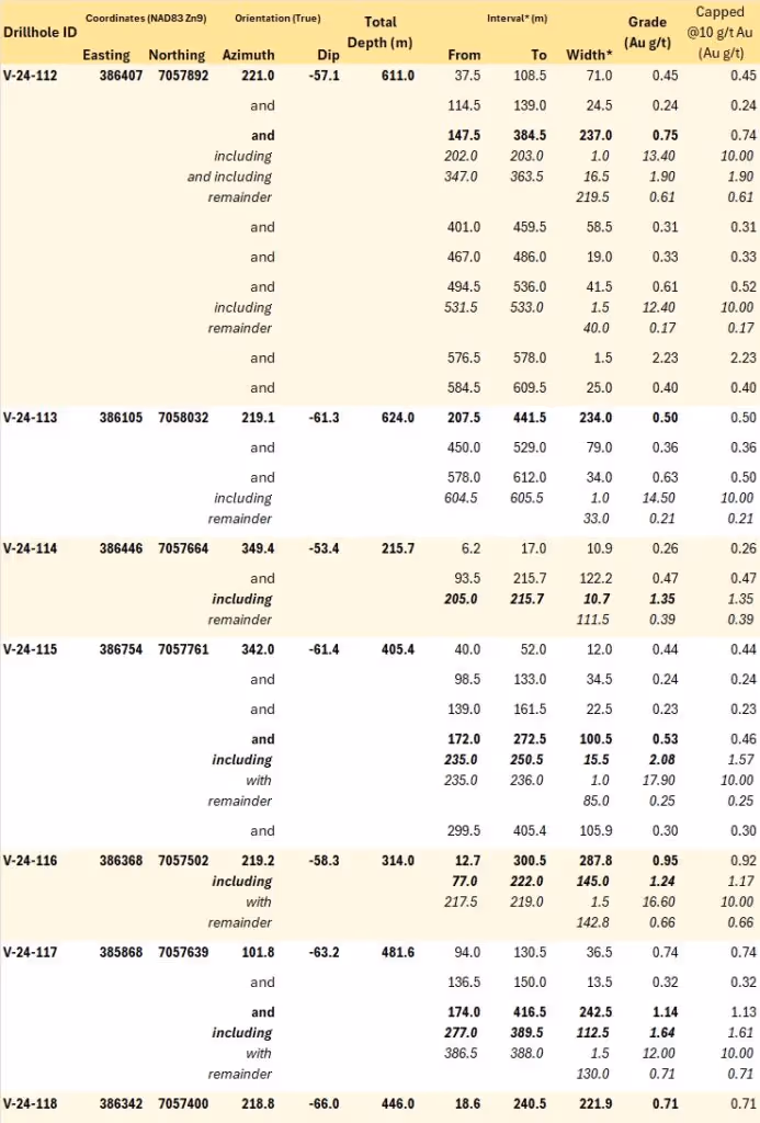 Including non-mineralized intervals, V-24-112 averages 0.5 g/t Au over 599.9 m downhole from bedrock surface at 11.1 m.