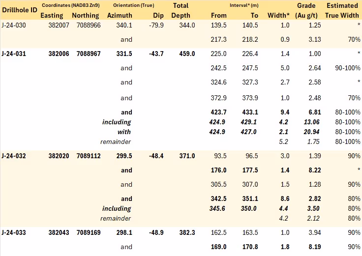 Drillhole J-24-031 is collared in mudstone and intersects the siltstone unit marking the steep flank of a fold interference pattern at a downhole depth of 246.5 m. An interval of 31.4 m within the mudstone averages 0.68 g/t Au from 216.1 m downhole. This interval features shallow south-dipping quartz-carbonate veins and a meter-thick, east-west oriented sub-vertical quartz carbonate vein that contains visible gold (Figure 5).