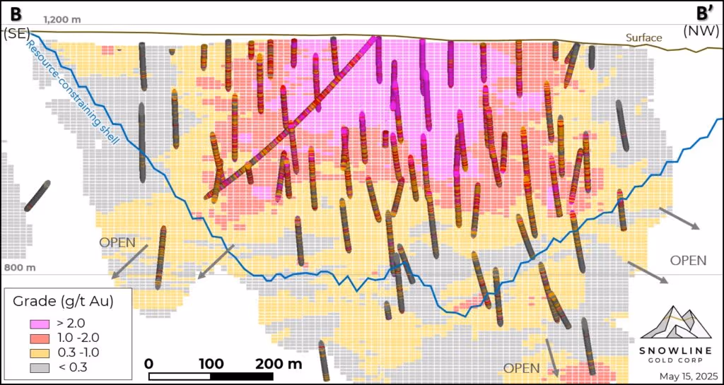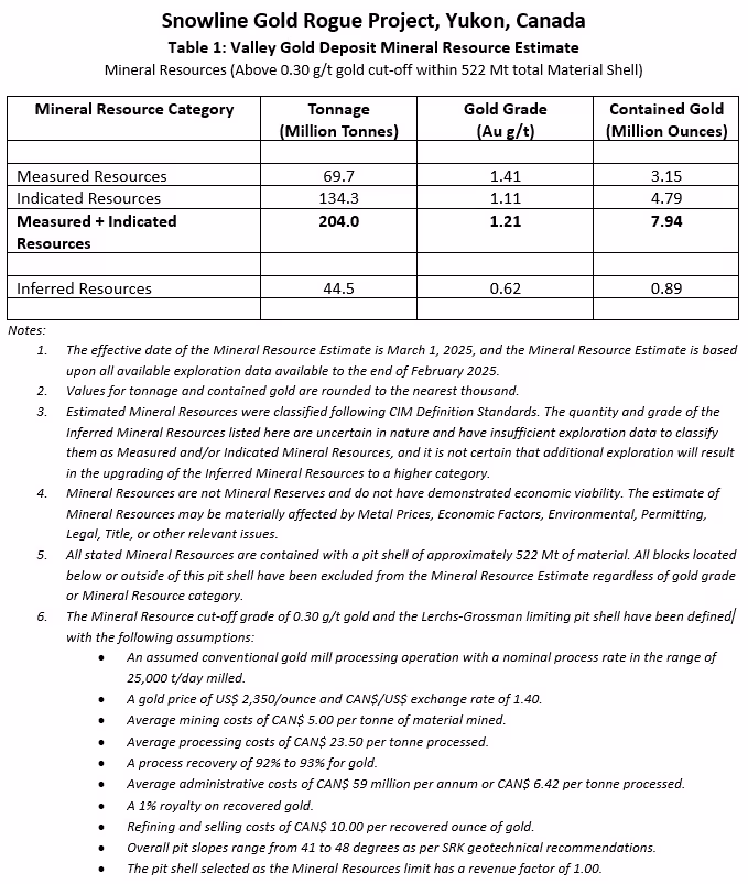 Vancouver, B.C., May 15, 2025: SNOWLINE GOLD CORP. (TSX-V: SGD) (OTC: SNWGF) (the “Company” or “Snowline”) is pleased to report an updated Mineral Resource Estimate (MRE) prepared in accordance with National Instrument 43-101 – Standards of Disclosure for Mineral Projects (NI 43-101) standards for the Valley gold deposit on its 100% owned, 1,110 km2 Rogue Project in Canada’s Yukon Territory.