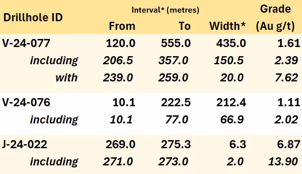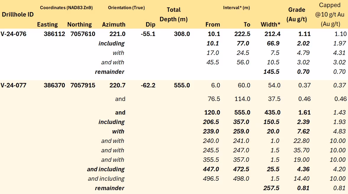 - Hole V-24-077, along the northeast boundary of Valley’s current mineral resource estimate, averaged 1.61 g/t Au over 435.0 m, including 2.39 g/t Au over 150.5 m