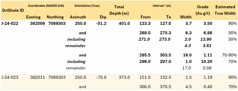 At Jupiter, assays have been received for the first two holes drilled in 2024. Both holes encountered elevated to anomalous (>1 g/t Au, to a high of 13.9 g/t Au over 2.0 m in J-22-024) gold mineralization, expanding the width and depth of the known mineralized system at Jupiter (Table 3).
