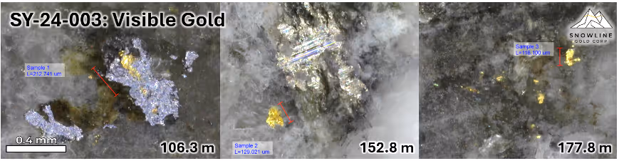 Figure 5 – Instances of visible gold in SY-24-003, Sydney target, Cynthia Project, at 106.3 m, 152.8 m and 177.8 m downhole.As with mineralization at Valley, gold is present in sheeted quartz veins as native gold. At Cynthia visible gold occurrences are spatially associated with bismuthinite and molybdenite. Three different veins throughout the 458.1 m length of SY-24-003 were observed to host trace visible gold. Assays for SY-24-003 and all holes at Sydney are pending.