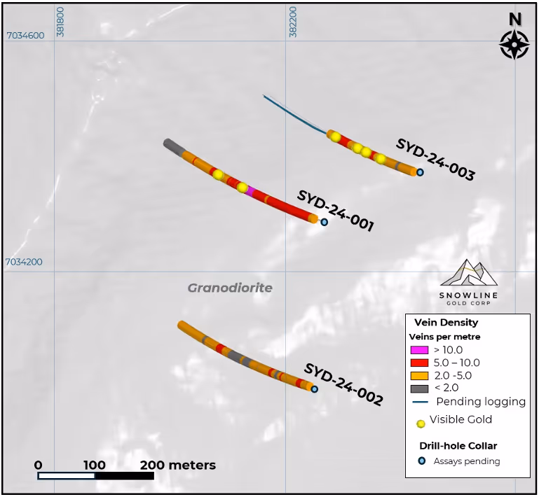 Figure 6 – Plan map of drill traces from Phase I drilling at the Cynthia Project’s Sydney target, showing vein densities and instances of visible gold. Assays for all three holes at Sydney are pending.