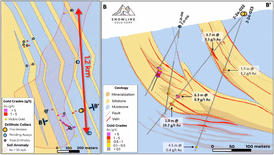 Hole J-24-022 was drilled as a 170 m step-back from J-21-015 (3.6 m @ 13.7 g/t Au, including 0.95 m @ 25.2 g/t Au, see Snowline news release dated November 18, 2021). It encountered 3 primary zones of mineralization. The upper zone, averaging 3.50 g/t Au over 3.7 m, is interpreted as a new mineralized structural corridor subparallel to mineralization encountered in 2021. The lower two zones, including an interval of 6.87 g/t Au over 6.3 m downhole, along with mineralization seen in J-24-023, extend to depth the mineralized corridor encountered in 2021 (Figure 4). Assays for an additional 2,444 m in 6 holes from the Jupiter target are pending.