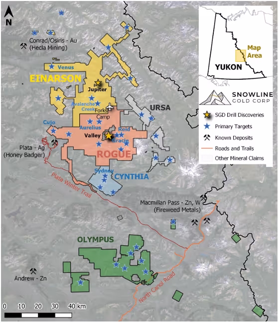 Figure 7 – Project location map for Snowline Gold’s eastern Selwyn Basin properties: Rogue, Einarson, Ursa, Cynthia and Olympus. The Valley target is one of several prospective reduced intrusion-related gold targets on the broader 30 x 60 km Rogue Project.
