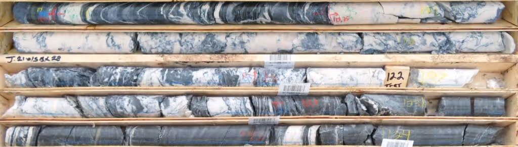 Massive to brecciated, well-mineralized quartz-carbonate material was intersected in drill hole J-21-015 at 119.1 m downhole, containing grey siltstone fragments and intercalated siltstone layers. Well-developed acicular arsenopyrite crystals (up to 10% locally) occur in and near stylolites in quartz, within mineralized siltstone fragments and in vein selvages. Pyrite occurs as medium to coarse grained crystals in quartz and host rocks. The highest gold grades occur towards and within the margins of the vein system (Figure 1 and Table 1).