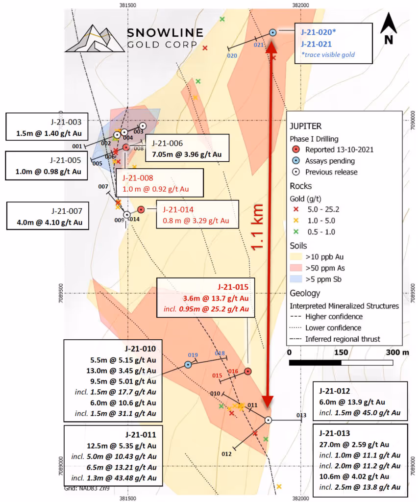 - Assays pending for 5 additional holes at Jupiter, including J-21-020 which intersected visible gold 1.1 km north of discovery holes, within a 3 km gold-in-soil anomaly.