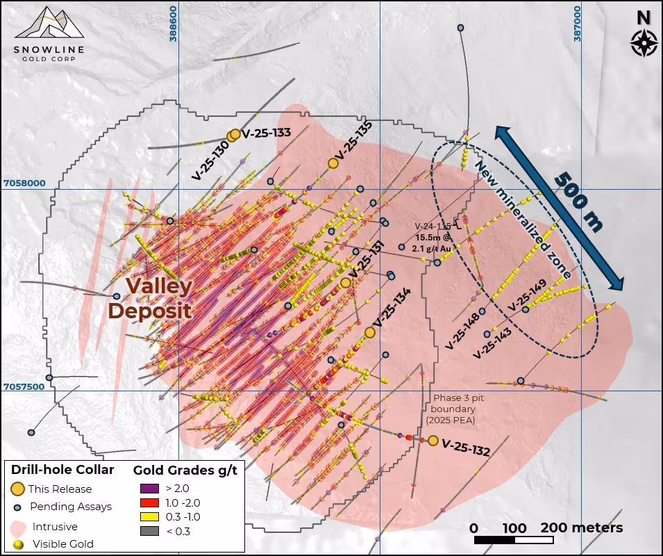 The Company has received results from six additional holes at Valley. These holes, V-25-130 through 135, continue to encounter broad zones of anomalous gold mineralization outside of the current Valley MRE and PEA mine plan. Hole V-25-132, for example, returned 209.0 m at 0.45 g/t Au, including 67.5m at 0.88 g/t Au, roughly 70 m southeast of the PEA mine plan. Where inside the existing block model, results will serve to inform potential recategorization of Inferred Mineral Resources (Figure 3, Table 3).