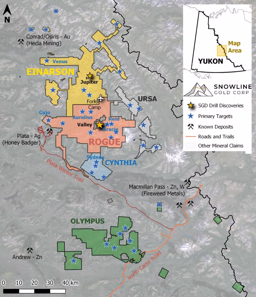 Snowline Gold Corp. is a Yukon Territory focused gold exploration company with an eight-project portfolio covering roughly 360,000 ha (3,600 km2). The Company is exploring its flagship 111,000 ha (1,110 km2) Rogue gold project along with its nearby 101,000 ha (1,010 km2) Einarson gold project in the highly prospective yet underexplored Selwyn Basin, with an active, ongoing 5-drill program in 2024. Snowline’s project portfolio sits within the prolific Tintina Gold Province, host to multiple million-ounce-plus gold mines and deposits. The Company’s first-mover position and extensive exploration database provide a unique opportunity for investors to be part of multiple discoveries and the creation of a new gold district.