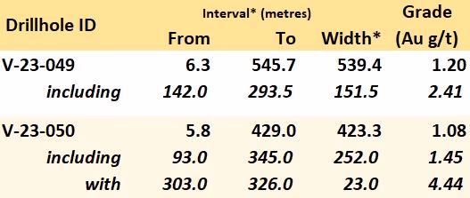 - Hole V-23-049 returned 539.4 m averaging 1.20 g/t Au from surface (entire length in mineralization), including 2.41 g/t Au over 151.5 m, confirming robust continuity and grade well below and east of mineralization in V-22-007