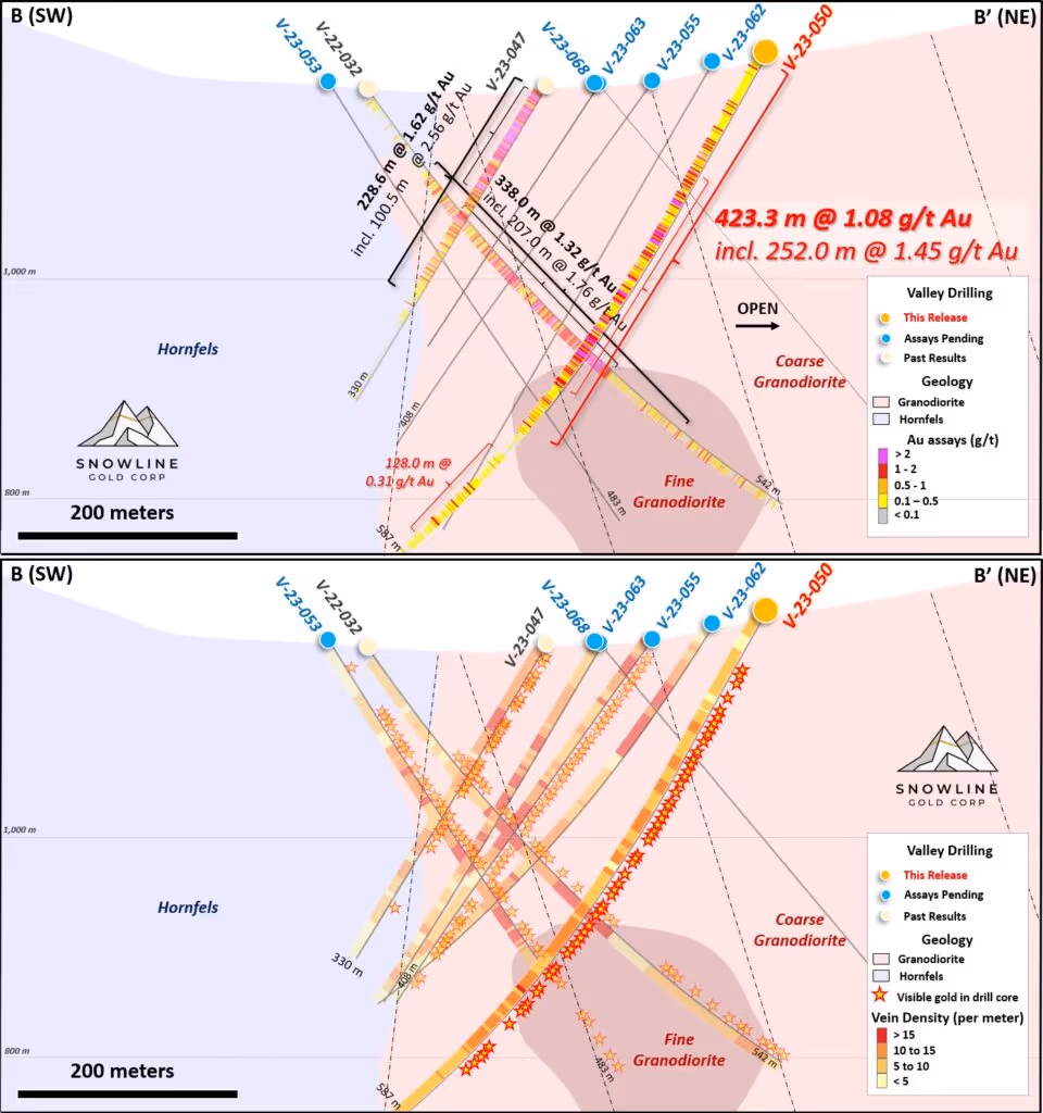 Hole V-23-049 is collared within the Valley intrusion as a 71 m step back along section and perpendicular to the dominant trend of mineralization from V-22-007 (410.0 m @ 1.89 g/t Au from surface including 146.0 m @ 3.24 g/t Au, see Snowline news release dated November 15, 2022). The hole is collared in coarse-grained granodiorite and crosses several small (meter-scale) porphyritic dikes before encountering a larger porphyritic body from roughly 365-420 m downhole depth. The hole ends in coarse-grained granodiorite with low quartz vein densities and generally low grades.