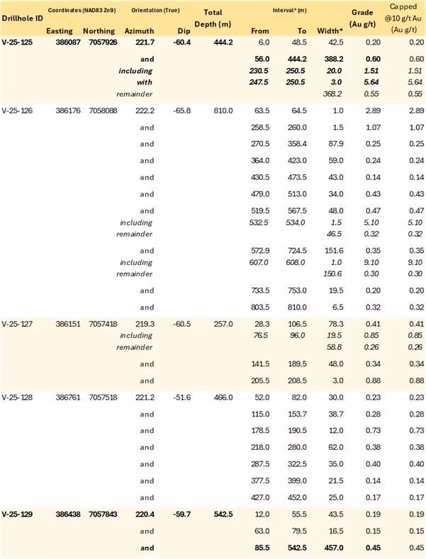 Table 1 – Anomalous gold intervals in drillholes V-25-025 through V-25-129 from the Valley deposit.
