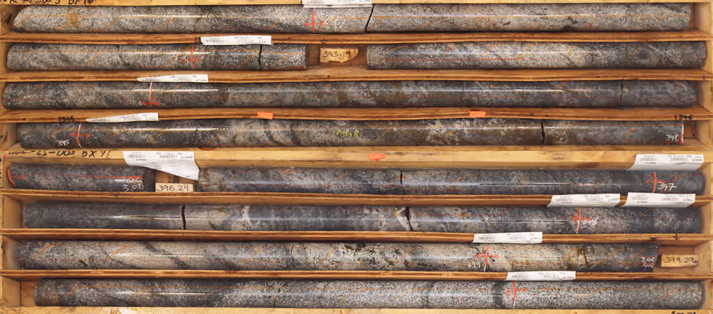 Figure 5 – DUK-25-003 drill core from 391.5 m to 400.3 m downhole. Mineralization at Duke includes disseminated acicular arsenopyrite within the intrusion and surrounding country rock. Minor bismuthinite and trace visible gold (denoted by orange flagging tape above the core) are present in the sheeted veins. Assays for this hole and all others from Duke are pending.
