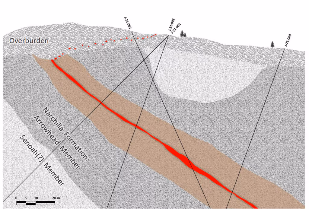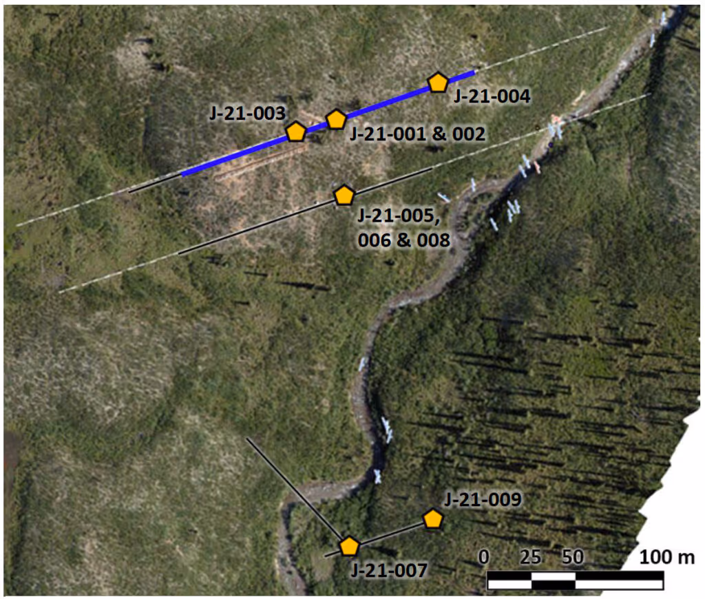 The ongoing Phase I diamond drill program initiated at the Jupiter zone tested a 3-kilometre long by up to 500-metre-wide area of anomalous gold-in-soil values accompanied by a prominent gold-bearing quartz boulder float train. All nine drill holes to have intersected a shallow north-easterly-dipping structural zone. (Figure 1). This zone comprises localized fault gauge and quartz, deformation and brecciation of sedimentary strata, and clay alteration of surrounding sedimentary units. The thickness of the mineralized zone in drill core, defined by the extent of arsenopyrite, ranges from 0.2 metres (Hole J-21-001; 50 m downhole) to 21.65 metres (Hole J-21-009; 18.5 m to 40.15 m downhole). True widths are currently unknown, though near 90-degree intersection angles with drill core suggest that true widths represent a substantial portion (75-100%) of widths intersected in drill core.
