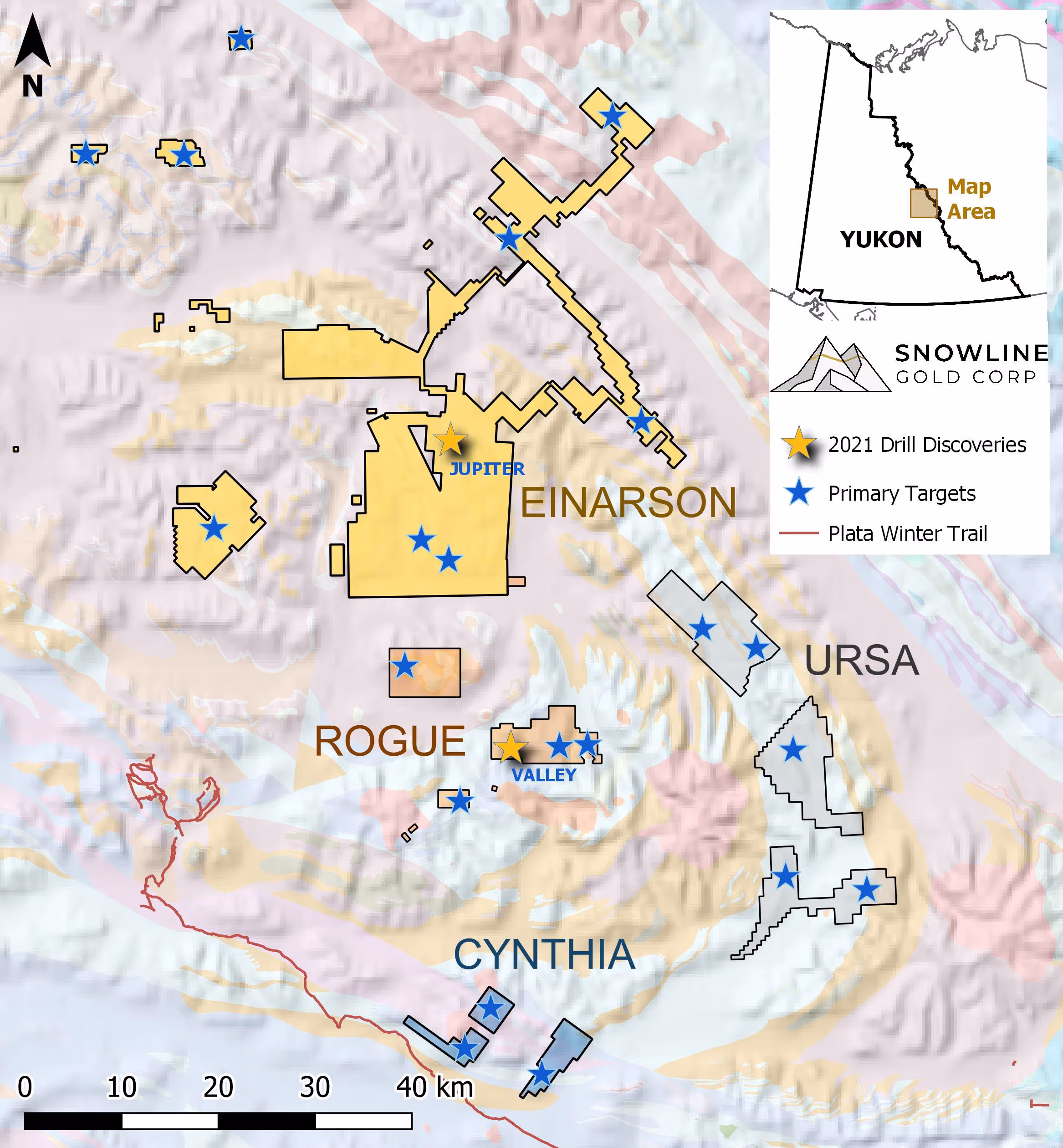 Snowline Gold Corp. is a Yukon Territory focused gold exploration company with a seven-project portfolio covering >100,000 ha. The Company is exploring its flagship 72,000 ha Einarson and Rogue gold projects in the highly prospective yet underexplored Selwyn Basin. Snowline’s project portfolio sits within the prolific Tintina Gold Province, host to multiple million-ounce-plus gold mines and deposits including Kinross’ Fort Knox mine, Newmont’s Coffee deposit, and Victoria Gold’s Eagle Mine. Snowline’s first-mover land position provides a unique opportunity for investors to be part of multiple discoveries and the creation of a new gold district.