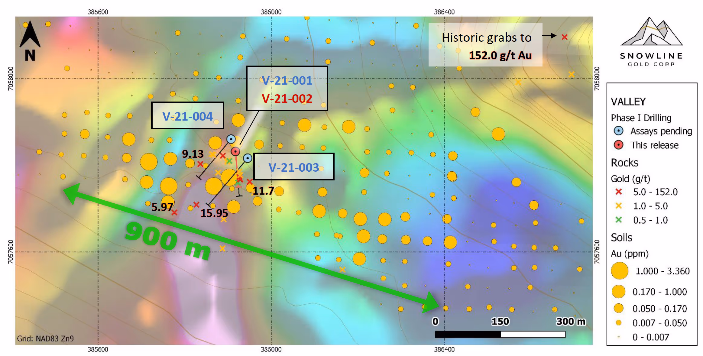 Vancouver, B.C., January 25, 2022: SNOWLINE GOLD CORP. (CSE: SGD) (US OTC: SNWGF) (the “Company” or “Snowline”) is pleased to announce initial drill results from Phase I drilling at the Valley zone on its Rogue gold project in the Yukon Territory, Canada. Hole V-21-002 intersected a broad zone of gold mineralization associated with visible gold in sheeted vein arrays. The hole averaged 1.01 g/t Au over 136.75 m from 35.25 m downhole, within a broader zone of mineralization averaging 0.85 g/t Au over 186.0 m from 31.5 m downhole. These results mark the in-situ discovery of a potentially significant gold system and demonstrate the fertility of the bulk-tonnage Valley gold target.