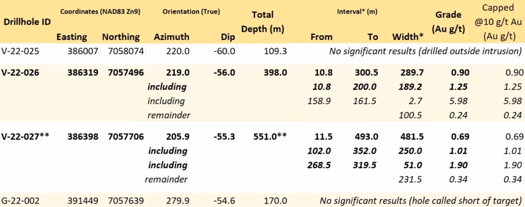 - Hole V-22-027 returned 1.01 g/t Au over 250.0 m, within a broader mineralized interval averaging 0.69 g/t Au over 481.5 m
