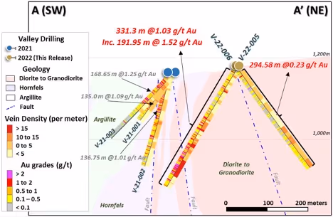 - Hole V-22-005 returned 1.52 g/t Au over 192.0 m from 132 m downhole, within a broad interval of 1.03 g/t Au over 331.3 m from bedrock surface to end of hole