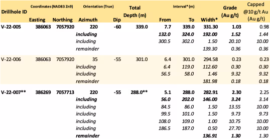 - The top of drill hole V-22-007 returned 2.30 g/t Au over 282.9 m from bedrock surface, including 3.24 g/t Au over 146.0 m from 56.0 m downhole