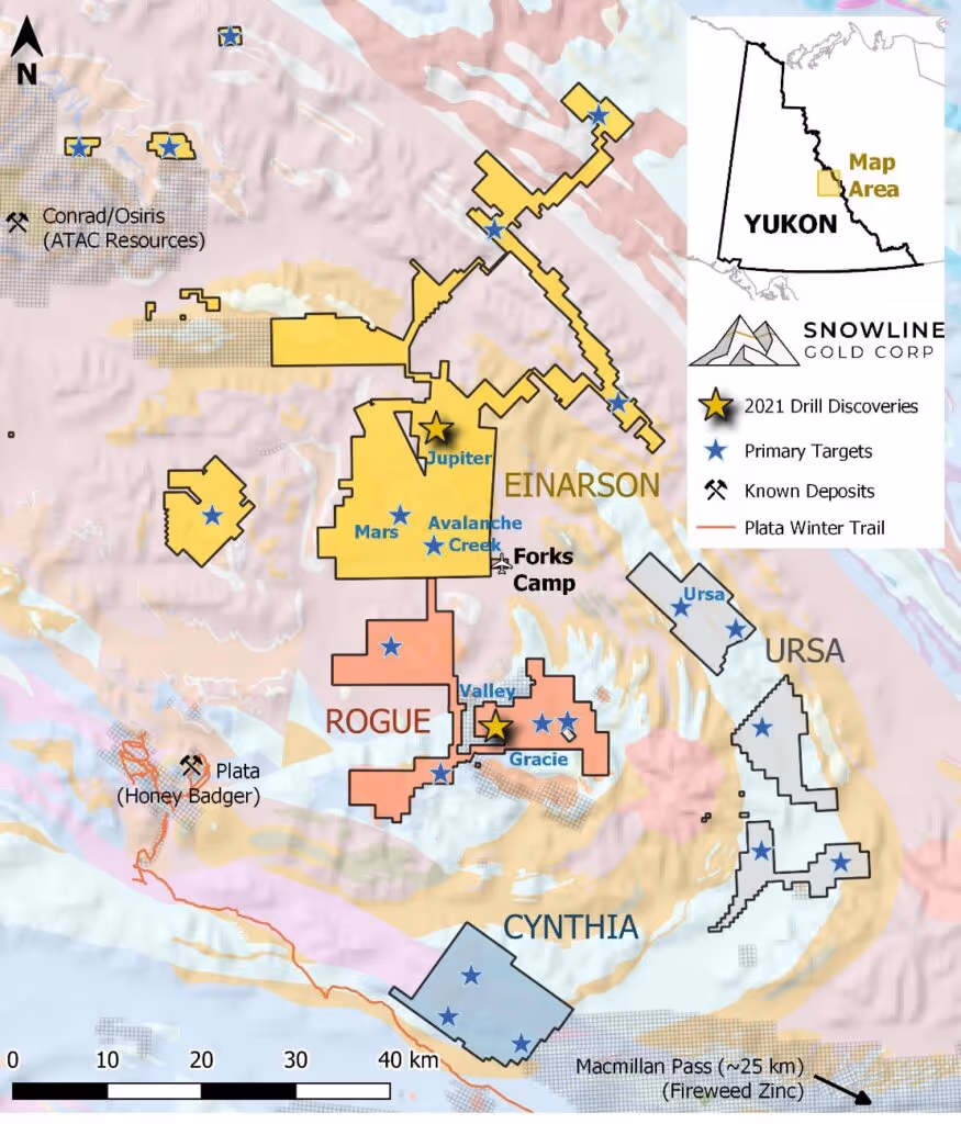 Snowline Gold Corp. is a Yukon Territory focused gold exploration company with a seven-project portfolio covering >127,000 ha. The Company is exploring its flagship >85,000 ha Einarson and Rogue gold projects in the highly prospective yet underexplored Selwyn Basin. Snowline’s project portfolio sits within the prolific Tintina Gold Province, host to multiple million-ounce-plus gold mines and deposits including Kinross’ Fort Knox mine, Newmont’s Coffee deposit, and Victoria Gold’s Eagle Mine. The Company’s first-mover land position and extensive database provide a unique opportunity for investors to be part of multiple discoveries and the creation of a new gold district.