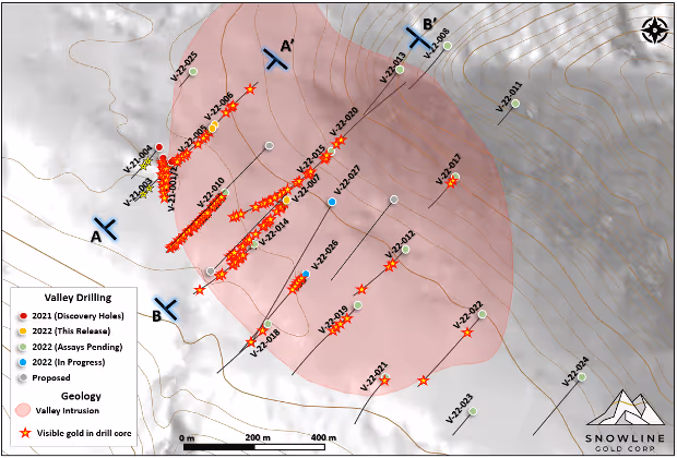 “Our initial assay results demonstrate increasing scale and fertility in the Valley Zone,” said Scott Berdahl, CEO & Director of Snowline. “In an aggressive step back 154 m to test the width of the system with Hole V-22-005 and an aggressive step out 340 m along the length of the system with V-22-007 we’ve encountered grades and intervals greater than those of our discovery holes last season. These high grades are associated with unusually high quartz vein densities that are present across a large area. The presence of consistent grades from near surface is also encouraging as it improves the potential economics of the prospect. The Valley discovery is a work in progress—we eagerly await the remainder of results for V-22-007 and for many other holes from this year’s ongoing drill campaign.”