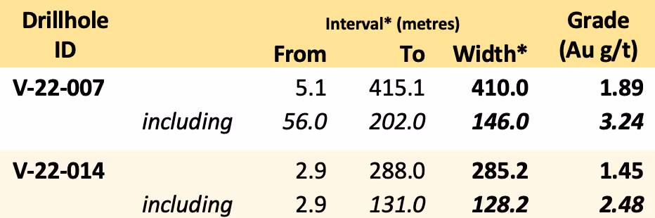 - Full results in for V-22-007 returned 1.89 g/t Au over 410.0 m (entire length in mineralization), including previously announced 3.24 g/t Au over 146.0 m