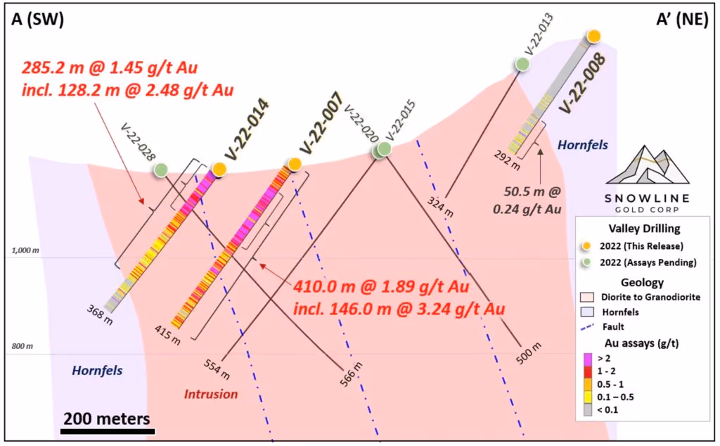 Hole V-22-014 was collared in the Valley intrusion, 160 m southwest of hole V-22-007 and 165 m southeast of hole V-22-010 (318.8 m @ 2.55 g/t Au including 108.0 m @ 4.14 g/t Au, see Snowline news release dated October 12, 2022). The hole demonstrates lateral and vertical continuity of near-surface, multi-gram-per-tonne gold mineralization encountered in previous holes at Valley (Figures 1 and 2).