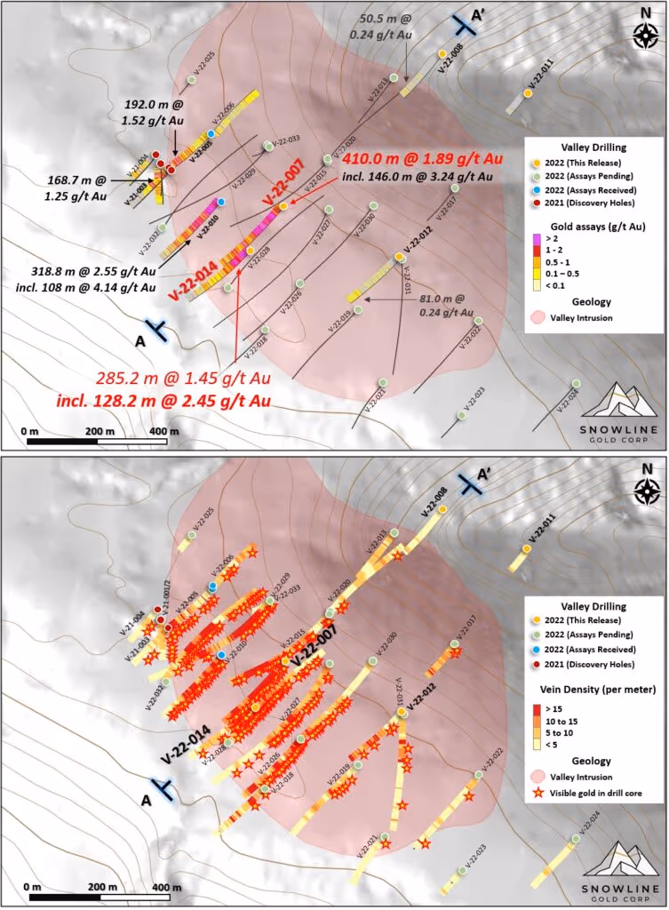 “Hole V-22-014 is the latest step-out drill hole to add significantly to the prospective scale and grade of our unfolding gold discovery at Valley,” said Scott Berdahl, CEO & Director of Snowline. “The continuity of strong grades from Valley’s central zone, seen both within holes along hundreds of metres and between holes spaced hundreds of metres apart, demonstrates the presence of a large and robust, unusually rich bulk tonnage gold system. Comparable quartz vein densities—often with numerous instances of trace visible gold—in many holes for which assays have yet to be received have the potential to carry similar grades. With analytical results pending for nearly 80% of our 2022 drilling, we expect further significant growth to this discovery in the coming weeks and months.”