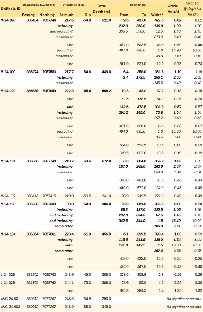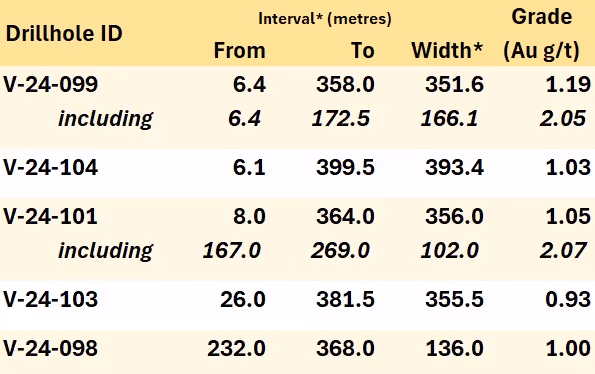 - Hole V-24-101 returned 1.05 g/t Au over 356.0 m from surface, including 2.07 g/t Au over 102.0 m, located towards the northeast boundary of current drilling
