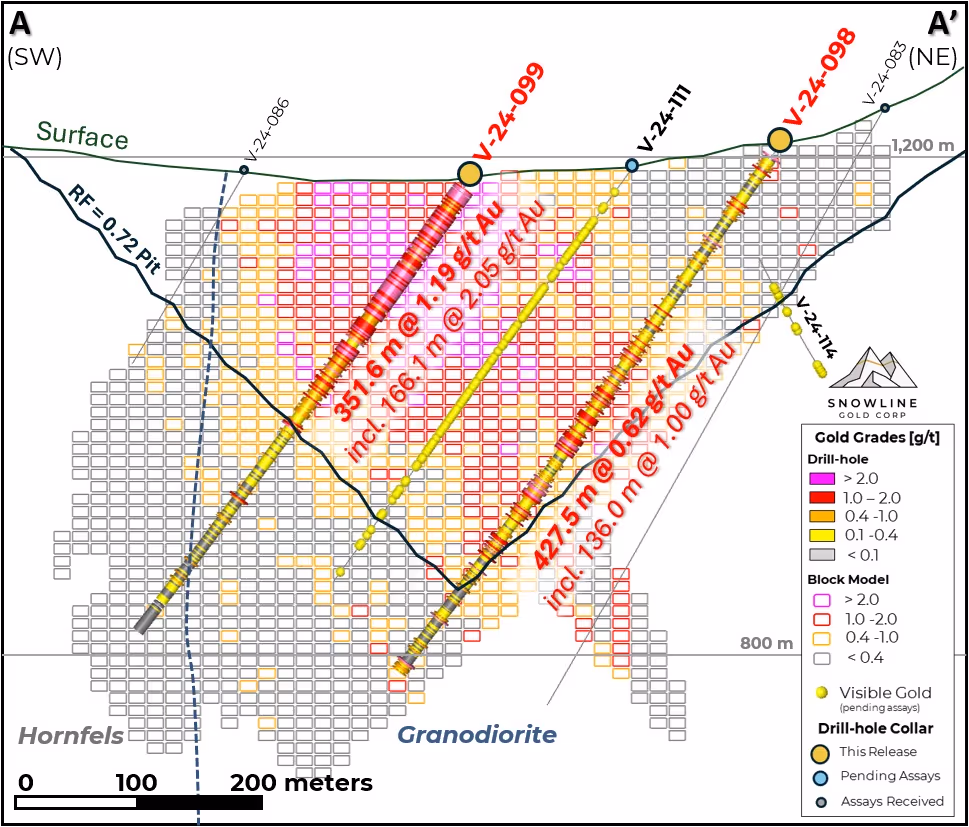 - Hole V-24-099 returned 1.19 g/t Au over 351.6 m, including 2.05 g/t Au over 166.1 m from surface, strong results infilling a 130 m gap along section
