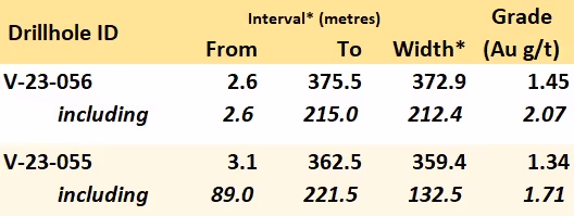 As with V-23-056, gold grades in V-23-055 are not affected by grade capping at 10 g/t Au, demonstrating the consistent nature of mineralization across the broad mineralized interval.
