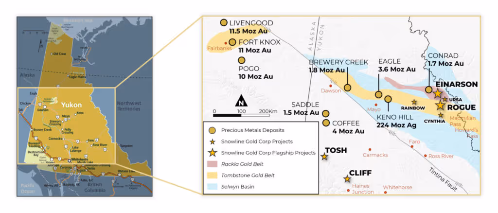 Snowline Gold Corp. is a Yukon Territory focused gold exploration company with an eight-project portfolio covering >333,000 ha. The Company is exploring its flagship >94,000 ha Rogue gold project in the highly prospective yet underexplored Selwyn Basin. Snowline’s project portfolio sits within the prolific Tintina Gold Province, host to multiple million-ounce-plus gold mines and deposits including Kinross’s Fort Knox Mine, Newmont’s Coffee deposit, and Victoria Gold’s Eagle Mine. The Company’s first-mover land position and extensive database provide a unique opportunity for investors to be part of multiple discoveries and the creation of a new gold district.