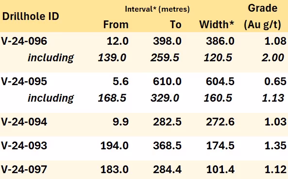 - Hole V-24-096 returned 1.08 g/t Au over 386.0 m from surface, including 2.00 g/t Au over 120.5 m, locally outperforming the mineral resource estimate block model
