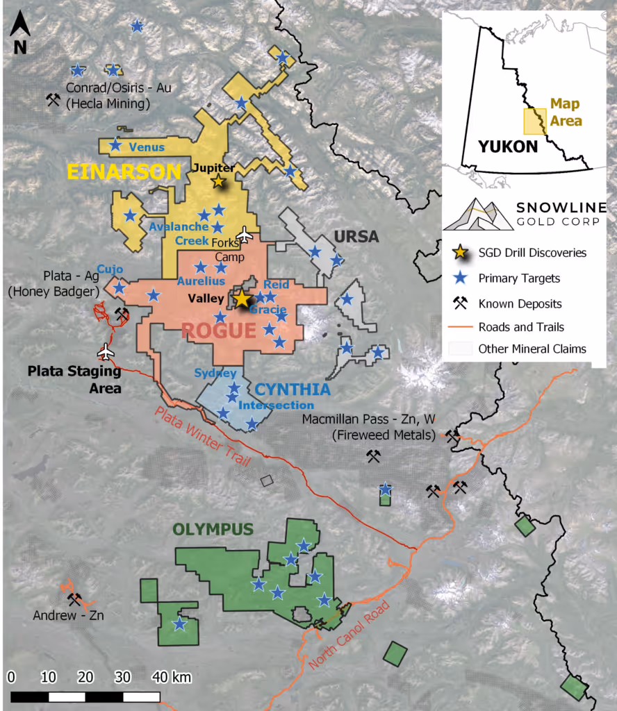 Figure 5 – Project location map for Snowline Gold’s eastern Selwyn Basin properties: Rogue, Einarson, Ursa, Cynthia and Olympus. The Valley target is one of several prospective reduced intrusion-related gold targets on the broader 30 x 60 km Rogue Project.