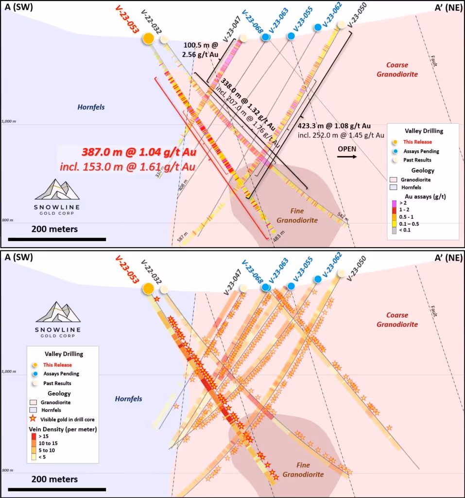 Hole V-23-054 is collared in coarse-grained granodiorite within the Valley intrusion as an 84 m step along strike to the southeast of the nearest hole, V-22-028 (363.5 m @ 1.40 g/t Au from surface including 129.9 m @ 2.03 g/t Au, see Snowline news release dated February 3, 2023). The hole is drilled to the northeast to efficiently test the near-surface southwestern margin of the Valley intrusion, and it tests the northeastern part of the mineralized corridor at depth in an orientation that crosscuts the dominant northwest strike of sheeted quartz veins.