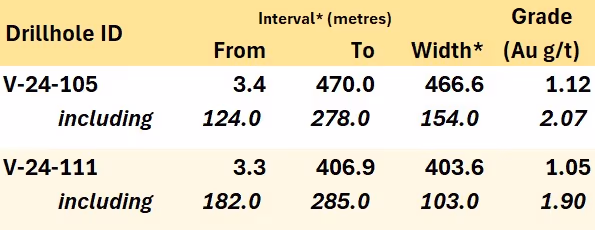 - Hole V-24-111 returned 1.05 g/t Au over 403.6 m from surface, including 1.90 g/t Au over 103.0 m froma 108 m gap along section near the eastern extent of drilling
