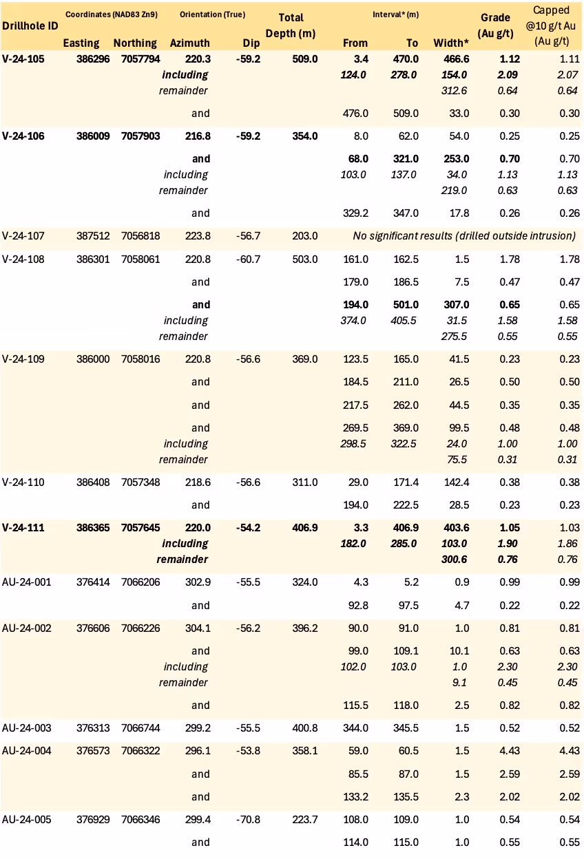 - Hole V-24-105 returned 1.12 g/t Au over 466.6 m from surface, including 2.07 g/t Au over 154.0 m, strong results infilling a 120 m gap along section