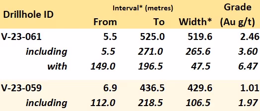 - Hole V-23-059 and V-23-060 demonstrate strong continuity and breadth in the southeastern part of the Valley system, returning 429.6 m averaging 1.01 g/t Au from surface (including 1.91 g/t Au over 133.0 m) and 109.5 m averaging 1.02 g/t Au respectively.