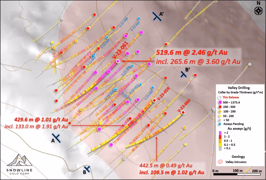 Hole V-23-059 is collared in coarse-grained granodiorite of the Valley stock, on section between V-23-044 (295.9 m @ 1.32 g/t Au from surface including 157.0 m @ 2.03 g/t Au, see Snowline news release dated September 11, 2023) roughly 132 m to its southwest and V-22-027 (481.5 m @ 0.69 g/t Au including 250.0 m @ 1.01 g/t Au, see Snowline news release dated January 18, 2023) roughly 108 m to its northwest (Figures 1 and 4).
