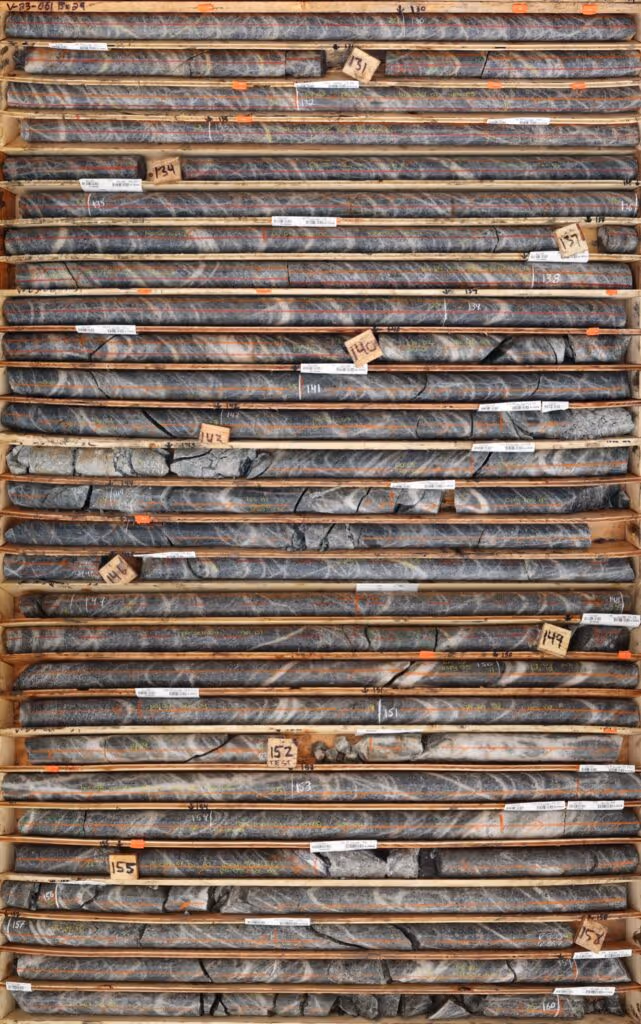 Figure 3 – High quartz vein density observed in V-23-061, from 129.3 m to 160.0 m downhole, as seen in a September 11, 2023 news release. This 30.7 m downhole interval averages 5.87 g/t Au and includes the top of a 47.5 m interval averaging 6.47 g/t Au from 149.0 m downhole. Orange flagging marks instances of trace visible gold. Multiple generations of quartz veins can be seen cutting the core at different orientations. NQ2 sized drill core shown is 5.1 cm in diameter.