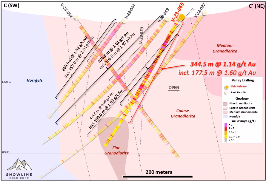Hole V-23-066 is collared in coarse-grained granodiorite within the Valley intrusion roughly 48 m northwest of the nearest hole, V-22-007 (410.0 m @ 1.89 g/t Au from surface including 3.24 g/t Au over 146.0 m Au starting at 56.0 m depth, see Snowline news release dated November 15, 2022) and 58 m southeast of V-23-037 (383.8 m @ 2.47 g/t Au including 120.0 m @ 4.06 g/t Au from surface, see Snowline news release dated August 3, 2023).
