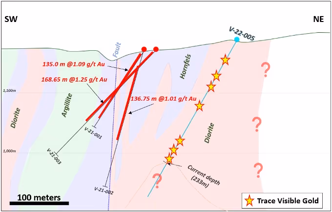 Figure 3 – Schematic cross section showing relationship of V-22-005 to previous drilling. Instances of sub millimetre visible gold identified in initial evaluation of the drill core are denoted by yellow stars. Visible gold has now been observed in all 5 of 5 total holes drilled at Valley. Note that holes V-21-001 and V-21-002 are collared behind the section and are coming out of the page towards the viewer. The surface trace of the section is shown in Figure 4.