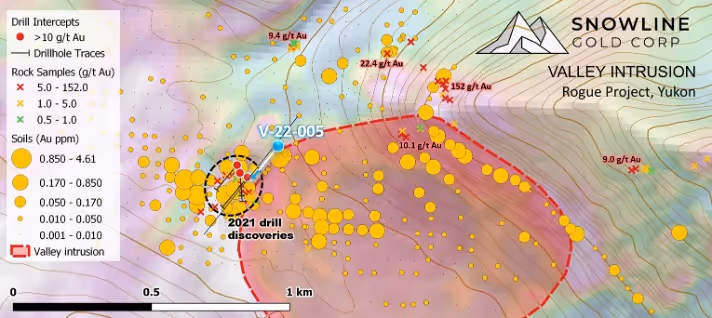 Valley is one of at least five bulk-tonnage gold targets present on Snowline’s Rogue project. The Gracie target, roughly 4 km to the east, covers a 5.1 km gold in soil and talus fine anomaly above an unexposed felsic intrusion (see Snowline news release dated April 7, 2022). Mineralization is thought to be similar to that at Valley. Following surface work to optimize drill targeting and assuming viable targets are identified, Phase I drilling will commence at Gracie in mid-season 2022.