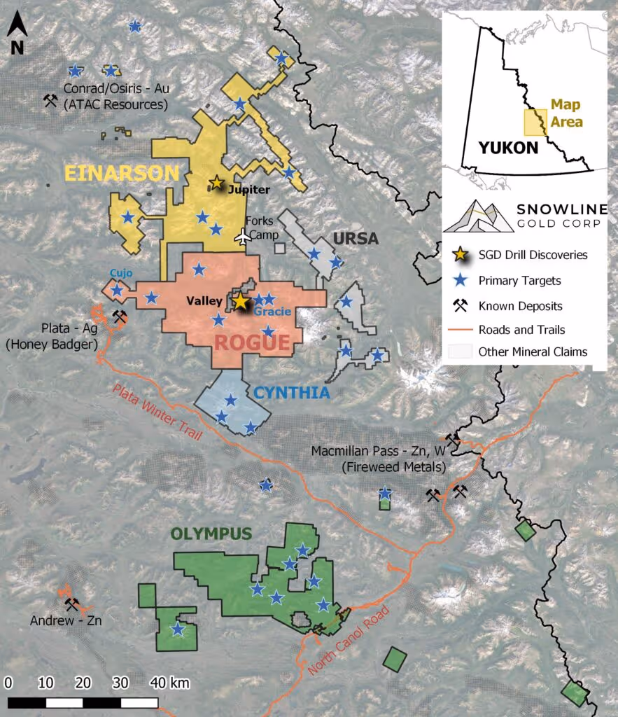 Figure 5 – Project location map for Snowline Gold’s eastern Selwyn Basin properties: Rogue, Einarson, Ursa, Cynthia and Olympus. The Valley target is one of several prospective reduced intrusion-related gold targets on the broader 30 x 60 km Rogue Project.