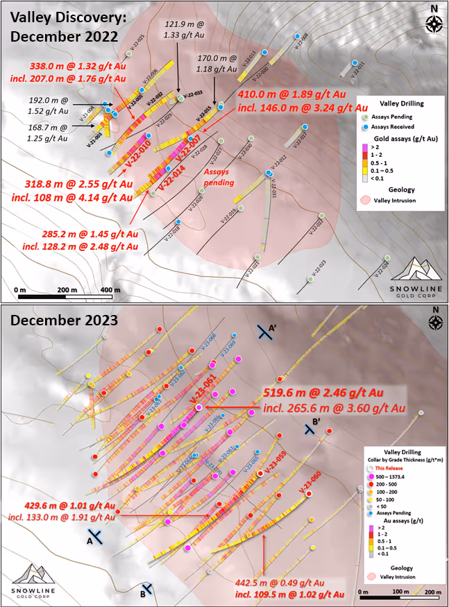 Figure 1 – Plan maps of the Valley intrusion showing drill results reported as of year-end 2022 (top) and 2023 (bottom). In just one year, the Company’s understanding of the mineralized system at Valley has increased substantially, with the scale, grade and consistency of the gold mineralization considerably de-risking the target. Note that the two figures use different scales and have use different symbologies for collar locations. Roughly 25% of total drilling from the Valley target in 2023 is still outstanding, with results expected in early Q1 2024.